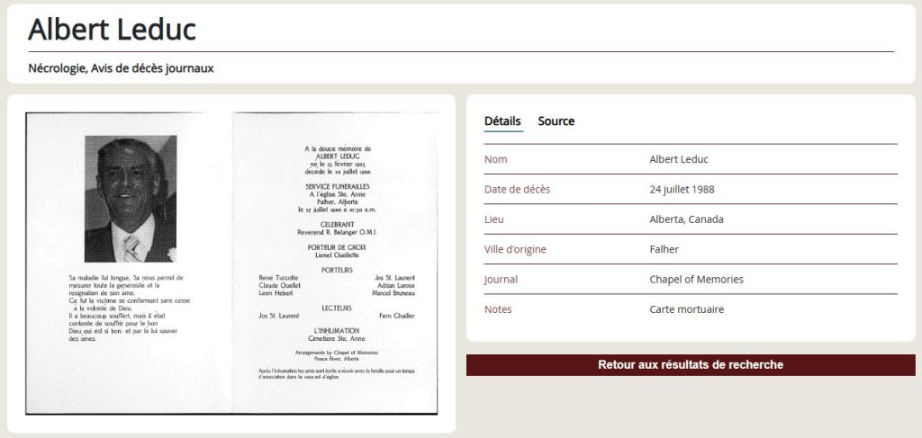 Avis de décès de descendants canadiens français de l’Alberta – Collection de la Société généalogique du Nord-Ouest