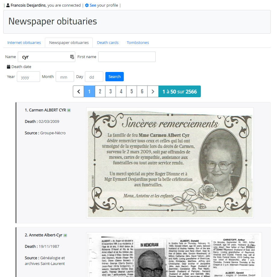 45,276 newspaper obituaries from Quebec, Ontario and the United States as well as 1897 memorial cards have been added to the Obituary Section, one of 15 collections available to Genealogy Quebec subscribers.