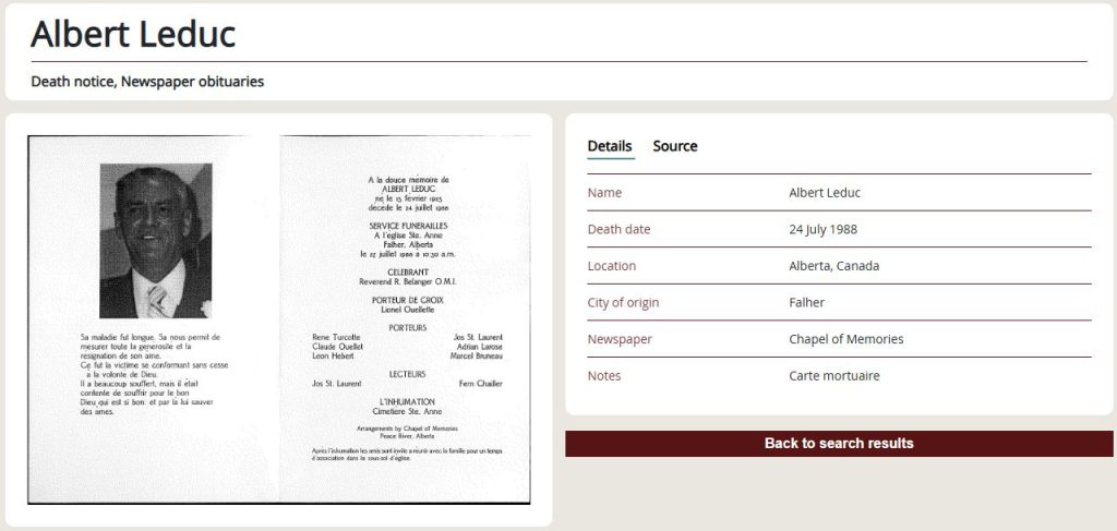 Obituaries of French-Canadian Descendants from Alberta – Northwest Genealogical Society Collection
