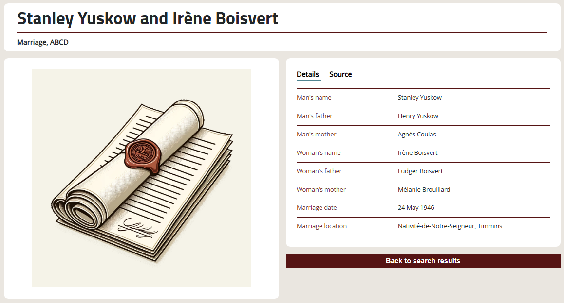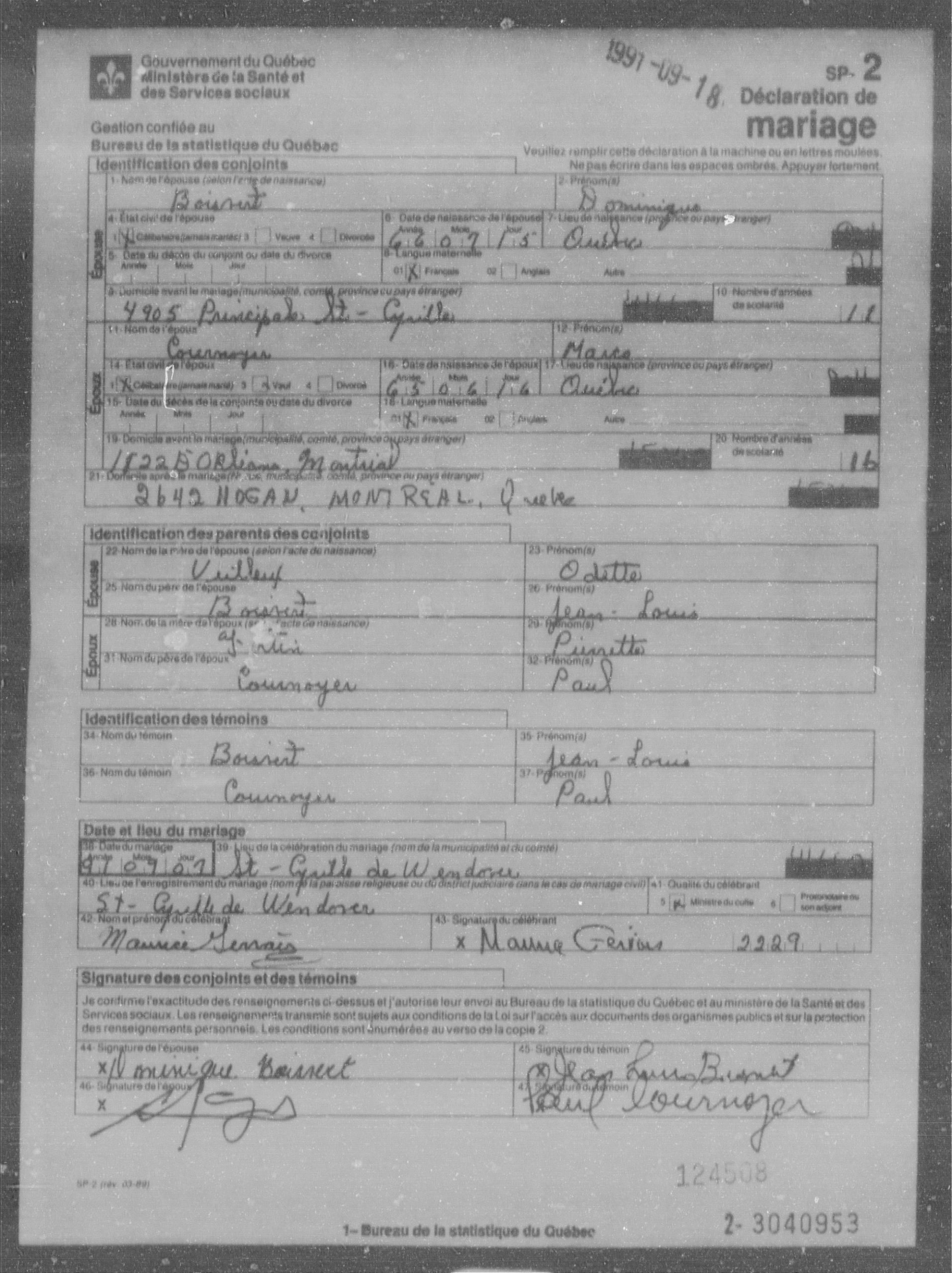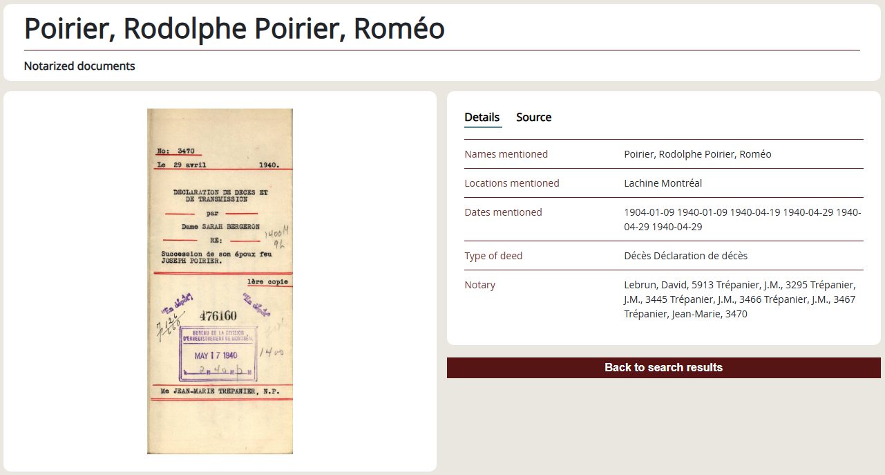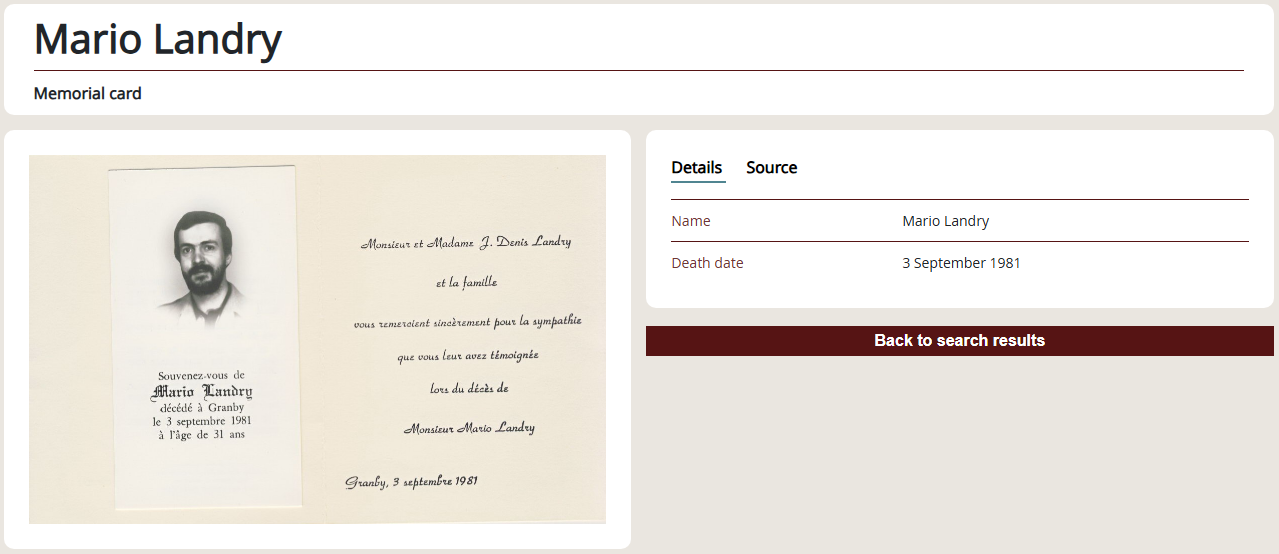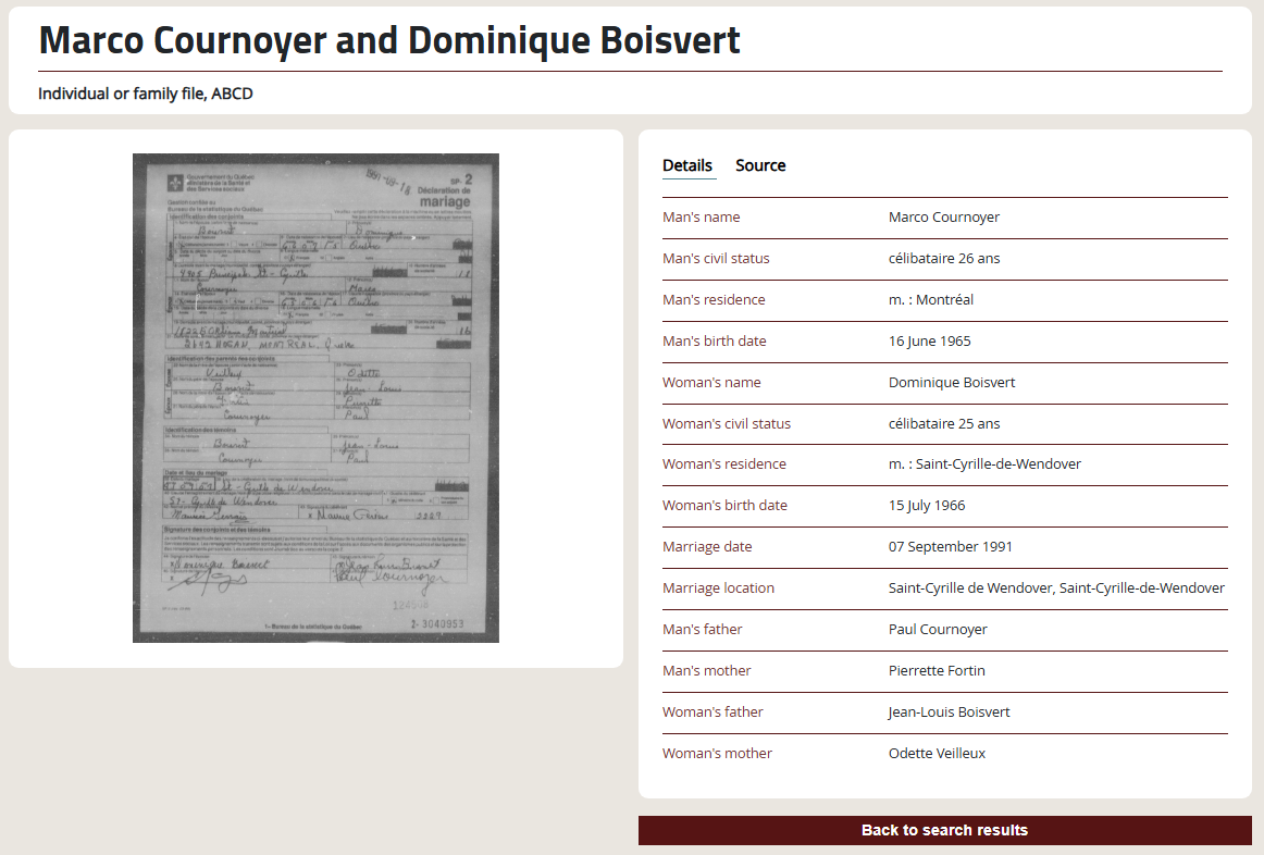 The collection includes an index to the Drouin Collection (parish registers for Quebec and Ontario) and the Marriages and Deaths 1926-1997 collection (marriage and death forms registered by the Quebec government during the 20th century). The original document is often available for consultation.
