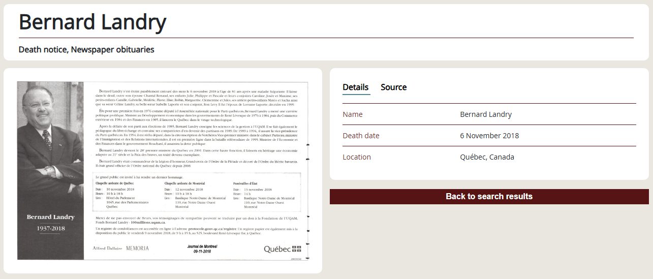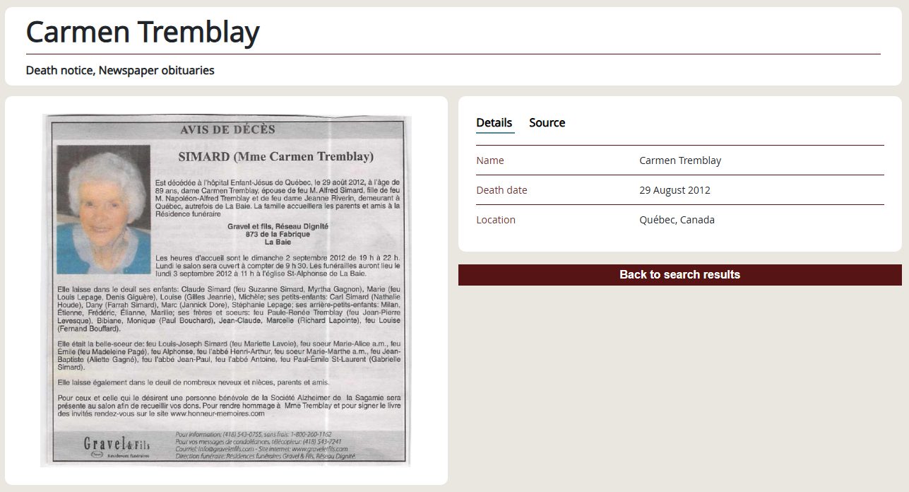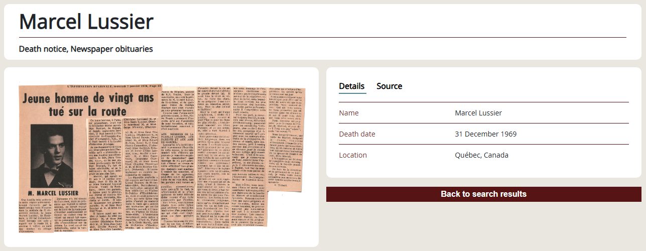 The Newspaper Obituaries collection, available exclusively on Genealogy Quebec, now contains 1,475,000 death notices.These are mainly from Quebec and Ontario, but also from the rest of Canada and the United States.