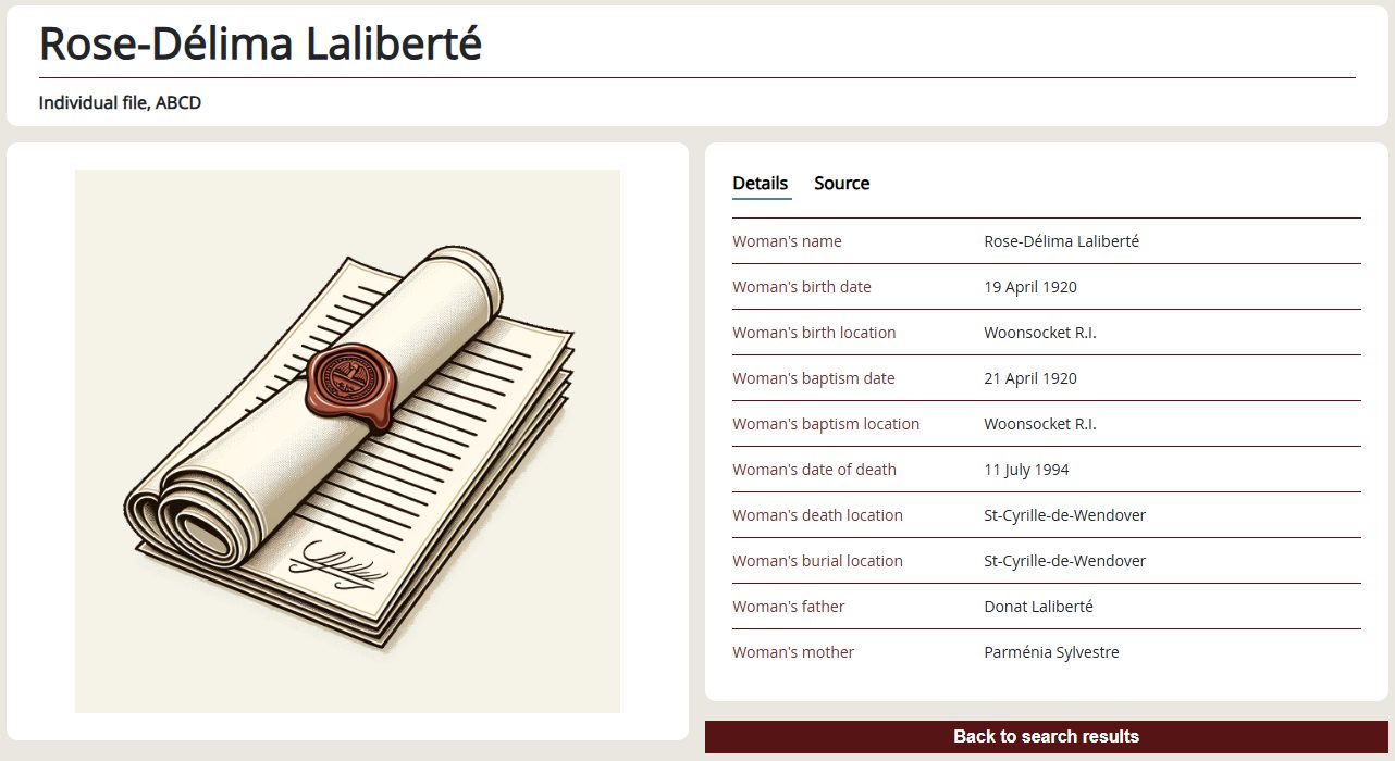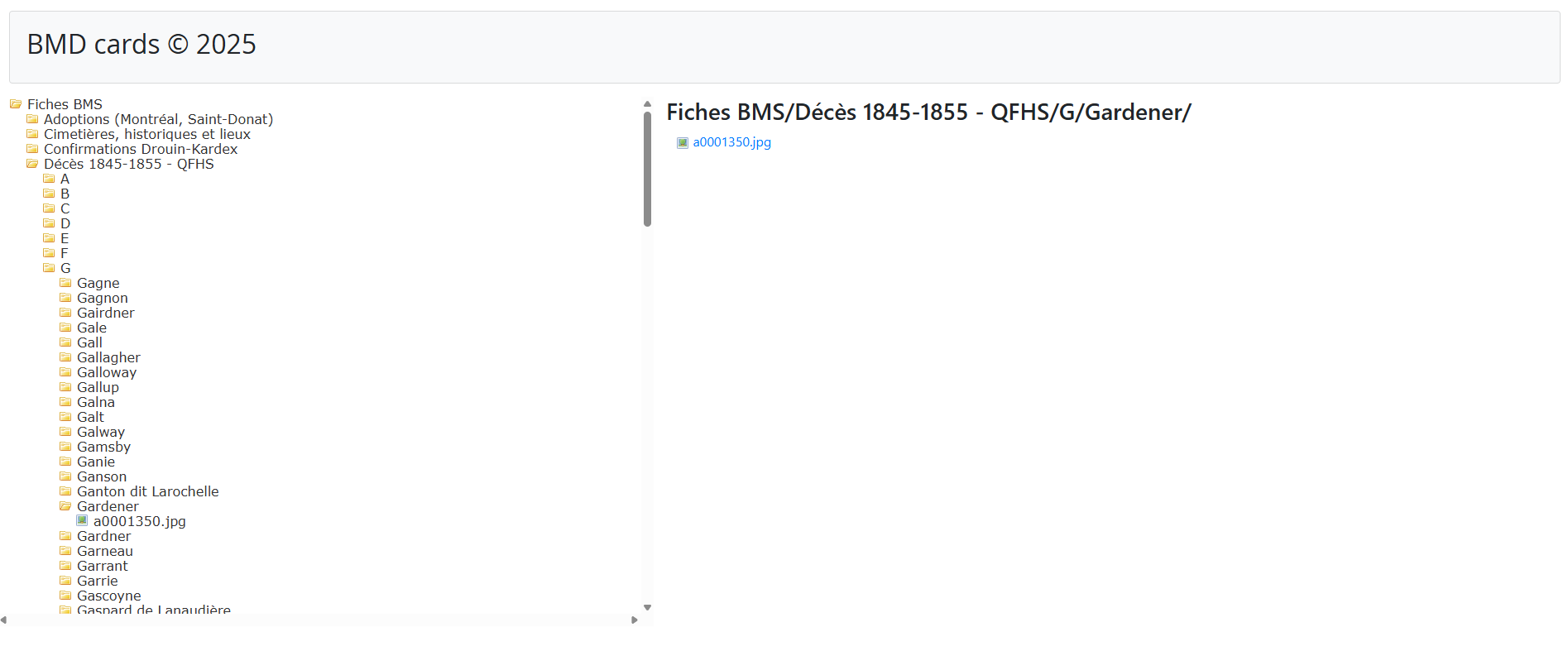 This tool contains the Antonin Loiselle, Kardex and Fabien fonds, as well as Ontario BMD cards, BMD cards sorted by cities and families, adoption cards, and death cards sorted by family name, provided by the Quebec Family History Society.