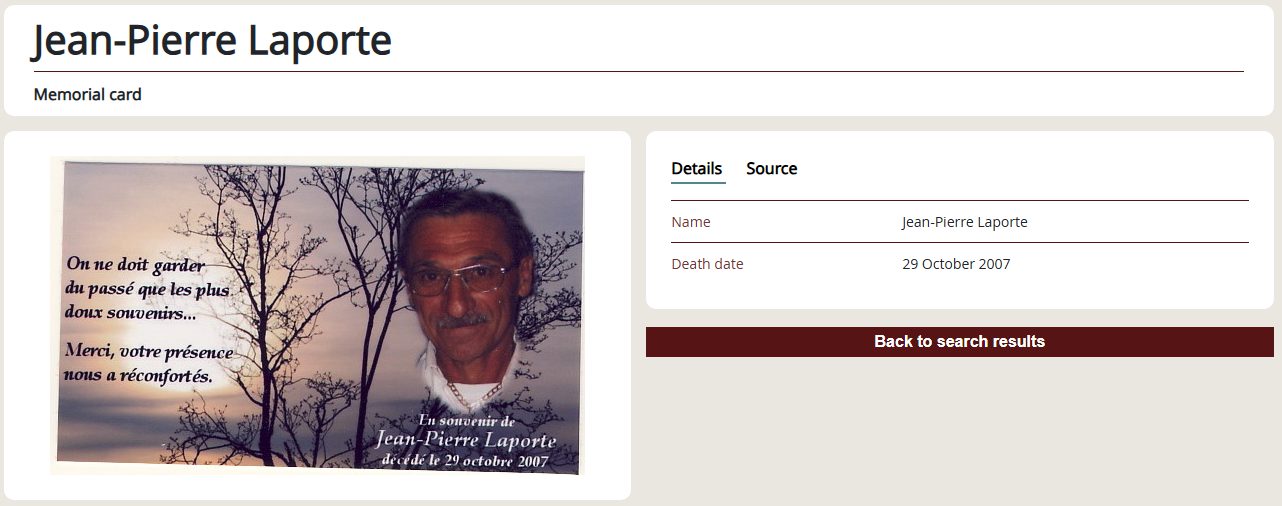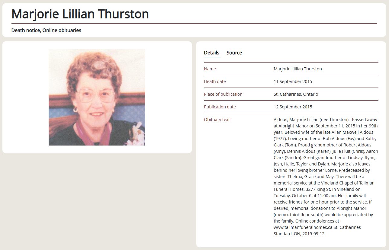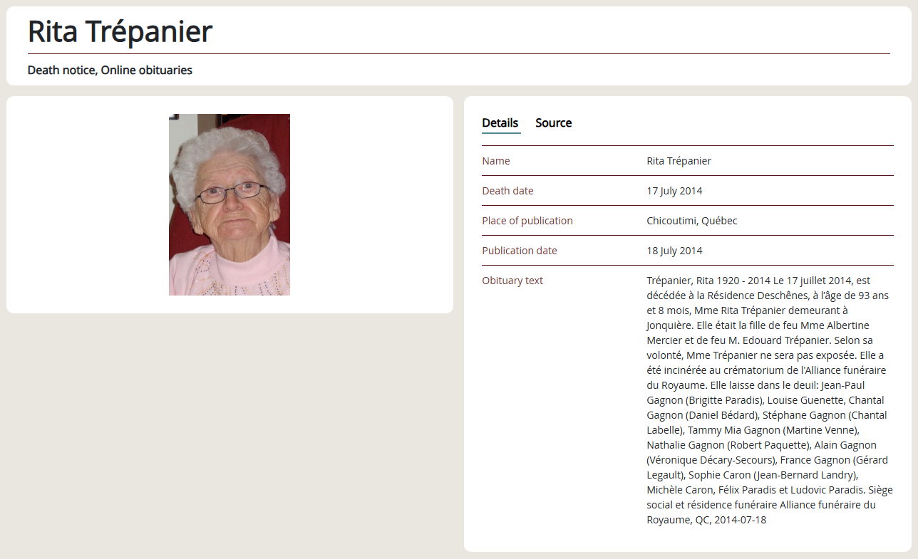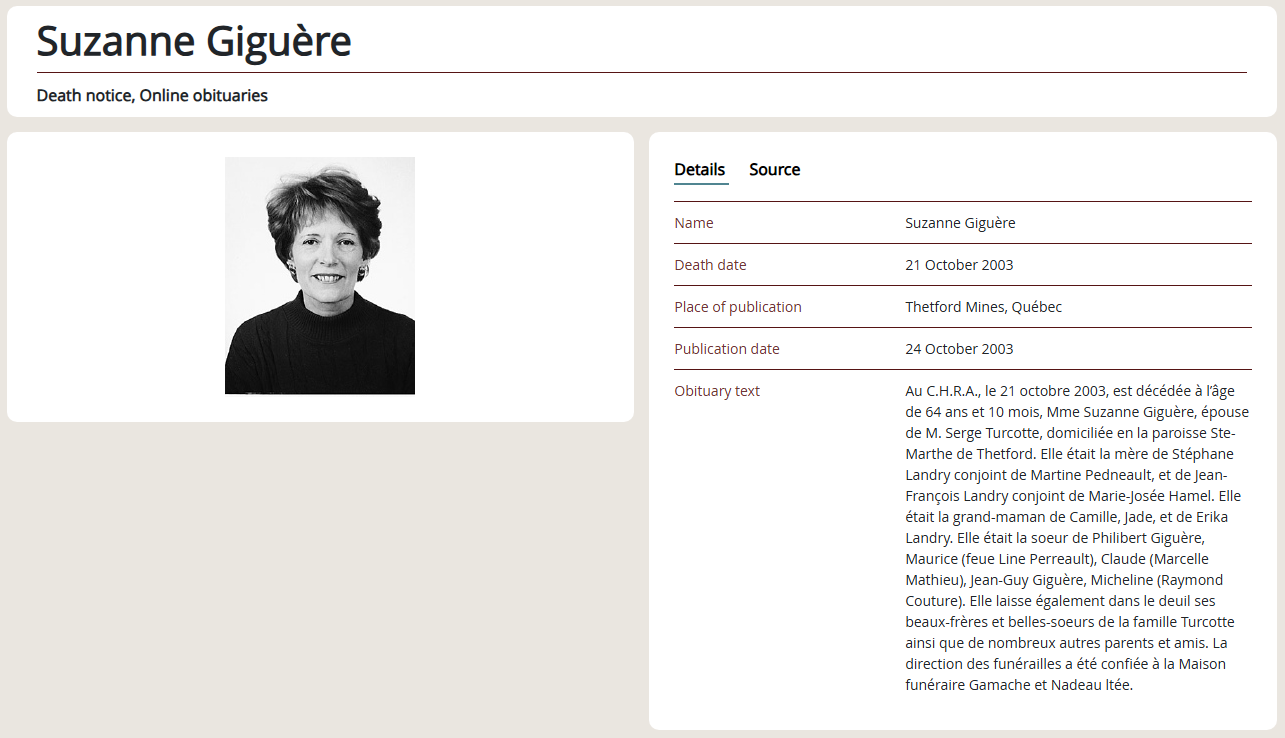 This collection contains obituaries published online by various Canadian funeral homes and newspapers. These notices come from across Canada and date from 1999 to the present. The index contains the name of the deceased, the date of death and the date of publication, as well as the full text of the obituary. A photo of the deceased is also often available. The collection is updated once or twice a year, to include obituaries from recent months.