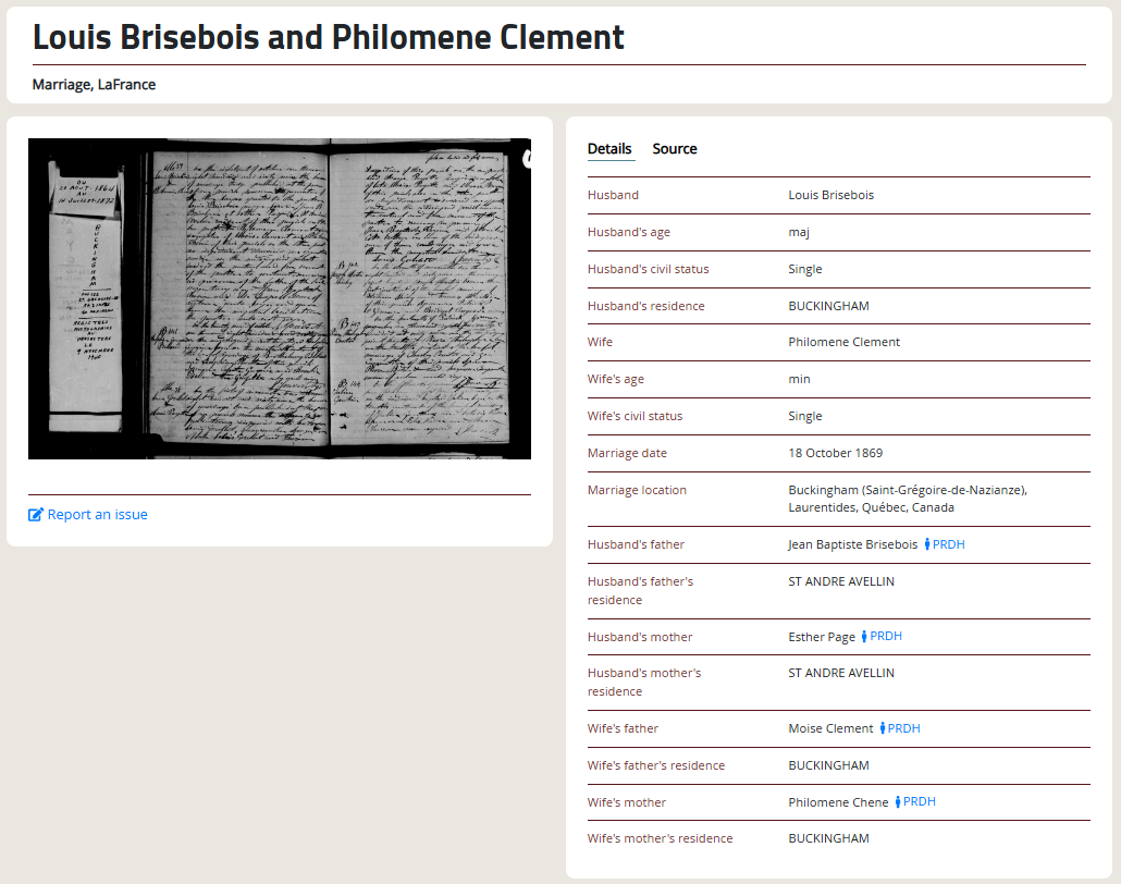 If the original document is not available, you can prioritize documents based on their source collection. In the case of birth, marriage and death records, the sources to prioritize are the LaFrance first, then the NBMDS, as these are databases containing transcriptions of original documents.