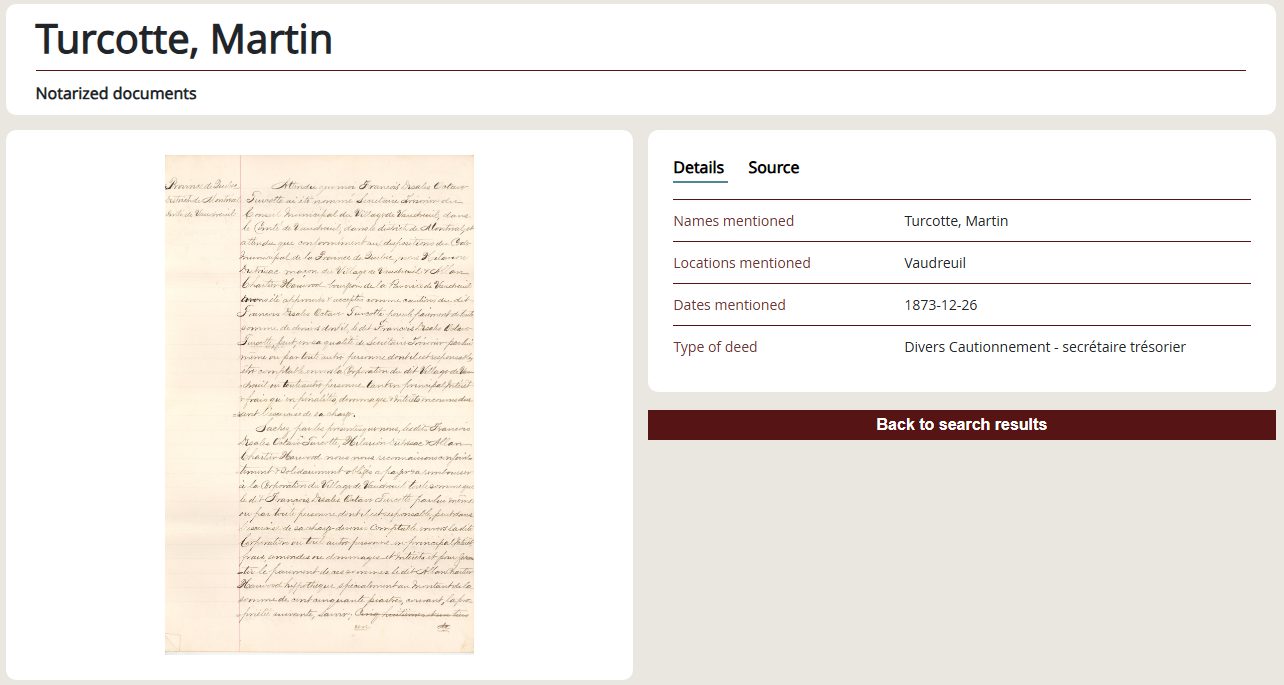 For example, if you search for “François Desjardins” as the first and last name, and set “Montréal” as the location, all documents on the site containing a “François Desjardins” and taking place in Montréal will appear first in the search results. However, once these results have been exhausted, the search will start displaying documents mentioning “François Desjardins”, regardless of location.