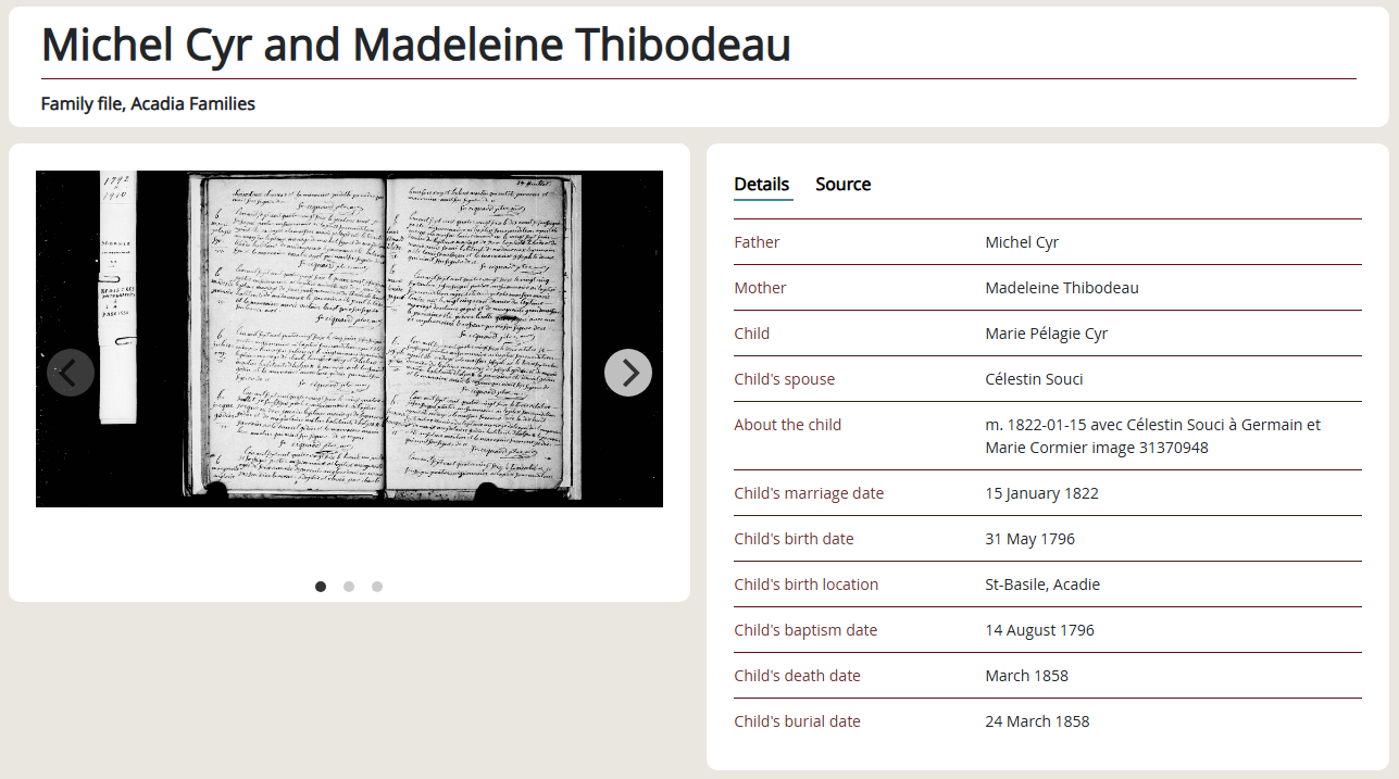 The Acadia – Families database contains files reconstructing Acadian families using parish records. The files generally contain the parents and one of their children, dates of birth, marriage and death for one or more of the individuals listed, as well as other complementary information. A link to the original source document(s) is often available.