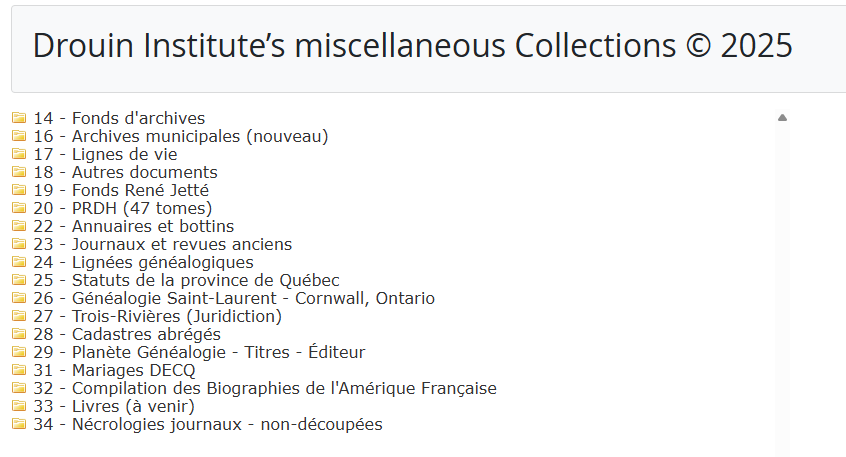As well as the following collections: Dossiers généalogiques Drouin, Affinités généalogiques Drouin, and Petit Drouin.