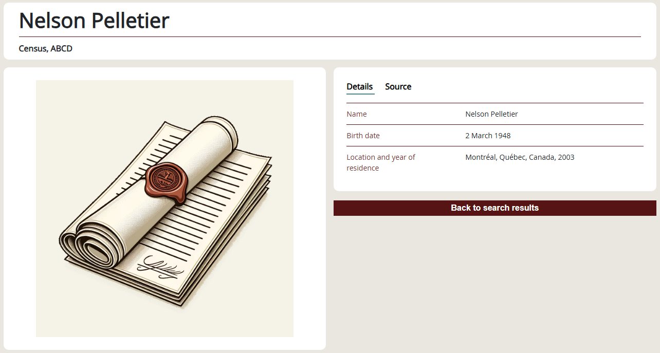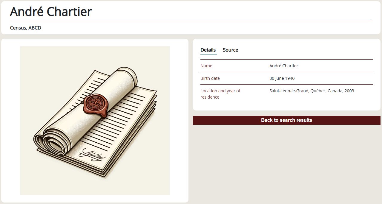 However, please note that the exact search does not prevent the display of results in which only one of the first names or surnames searched for is listed. For example, a search for “Jean-Sébastien Roy” will also produce results with “Sébastien Roy”, even with exact search enabled.