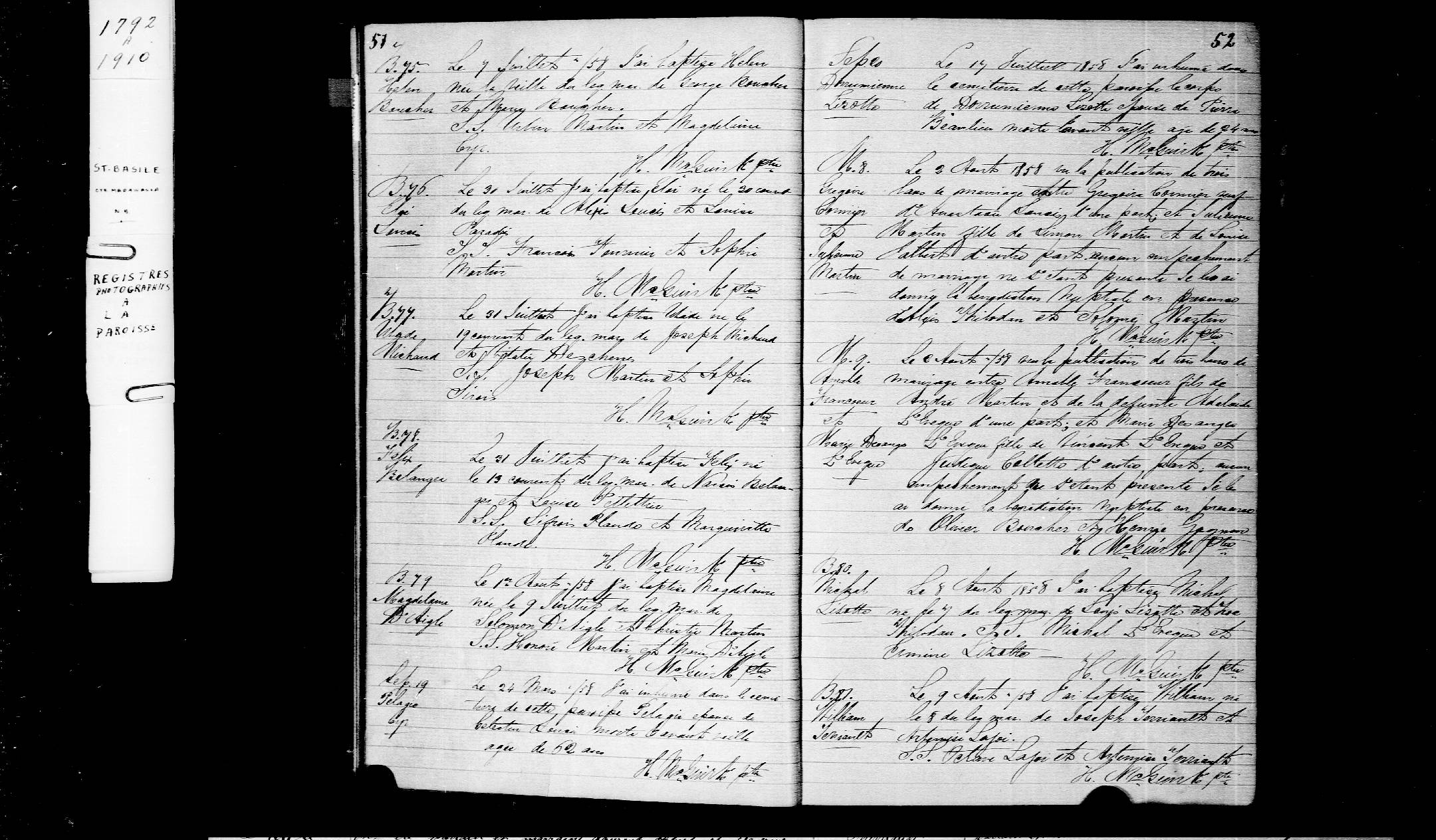 Le Fichier Histor: A collection of marriage records, including the origin of the individuals and a marriage contract. This collection includes all Catholic and Protestant marriages celebrated in Quebec from 1730 to 1825, as well as marriages celebrated in western French forts such as Detroit, and Acadian marriages.