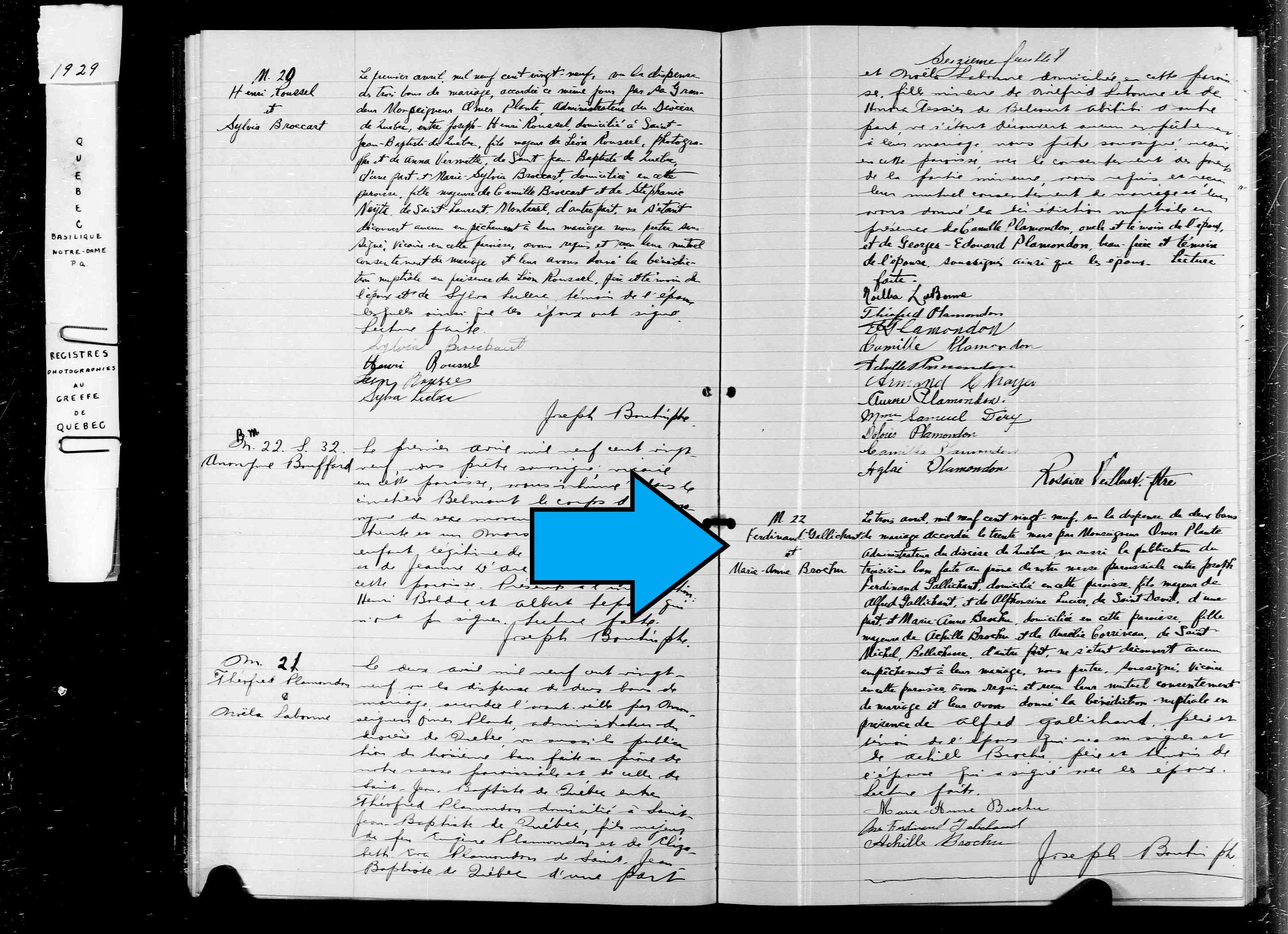 To trace a lineage, you will have to begin by finding a marriage belonging to that line on the LAFRANCE. If you are looking for your own lineage, your parents, grandparents or great-grandparents’ marriage is a good place to start.