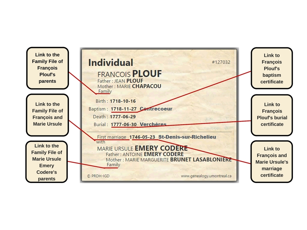 - The Programme de recherche en démographie historique (PRDH) is another valuable resource, offering a comprehensive database on families from early Quebec. It includes all Catholic baptism, marriage, and burial records from Quebec between 1621 and 1861, along with individual and family records that group and connect these events with the people involved, forming an extensive genealogical tree of Quebec’s population over 240 years.
