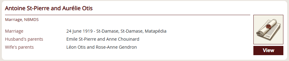 Results analysis: Among the results, he finds a marriage between an Antonio Saint-Pierre and an Aurélie Otis on June 24, 1919, in Saint-Damase, Matapédia. It’s a perfect match with his grandmother Berthe’s memories!