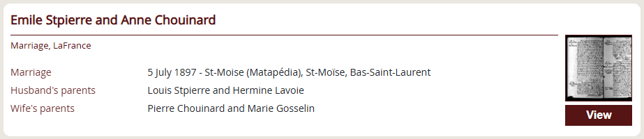 He first searches for the marriage of Émile Saint-Pierre and Marie Anne Chouinard. He finds it in 1897 in Saint-Moïse, which provides him with the names of Émile and Marie Anne’s parents.