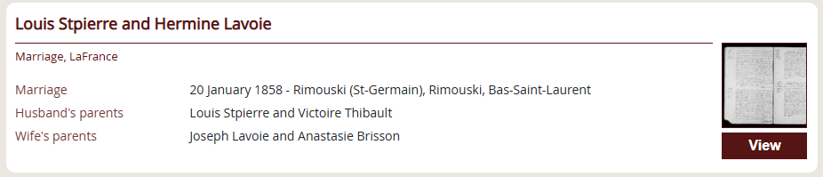 Continuing along this path, Patrick turns his attention to Émile Saint-Pierre’s parents, Louis Saint-Pierre and Hermine Lavoie. A search for them allows him to find their marriage: